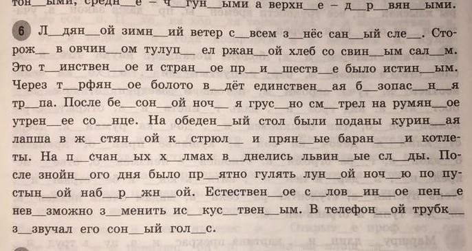 Ледяной зимний ветер совсем занёс санный след.Сторож в овчинном тулупе ел ржаной хлеб со свиным салом.Это таинственное и странное происшествие было истинным.Через торфяное болото ведёт единственная безопасная тропа.После бессонной ночи я грустно смотрел на румяное утреннее солнце.На обеденный стол были поданы куриная лапша в жестяной кастрюле и пряные бараньи котлеты.На песчаных холмах виднелись львиные следы.После знойного дня было приятно гулять лунной ночью по пустынной набережной. Естественное соловьиное пение невозможно заменить искусственным.В телефонной трубке зазвучал его сонный голос.
