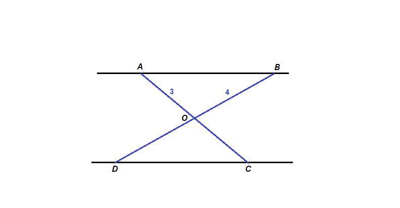 ∠ОАВ = ∠OCD как накрест лежащие при пересечении параллельных прямых АВ и CD секущей АС,