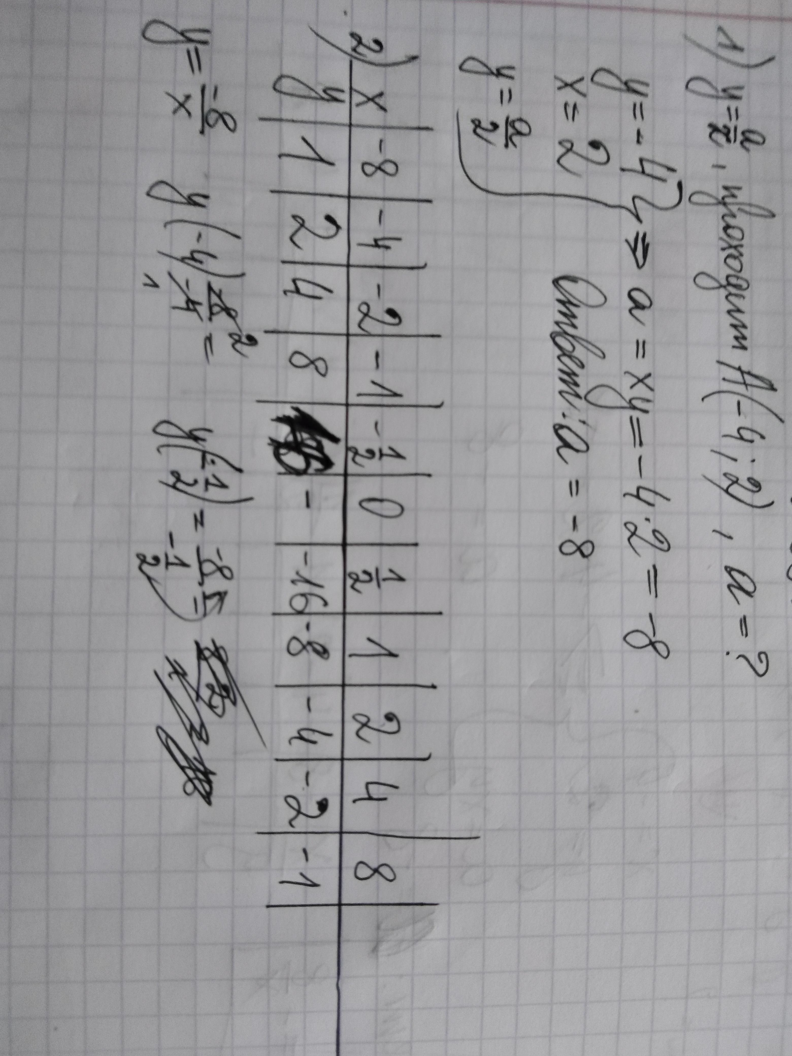 График обратно пропорциональной зависимости у=а/x проходит через точку А(-4;2). Найди значение а.