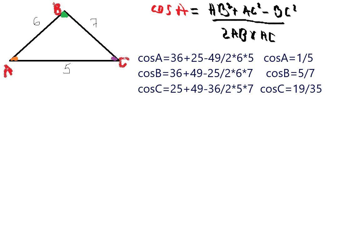 Сторони трикутника дорівнюють 5см 6см 7см. Знайдіть косинуси кутів трикутника і визначте його вид. Срочно!