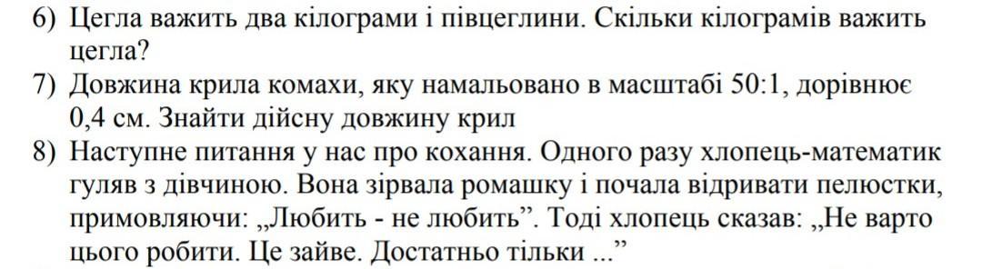 6)Важить 1 кг,тому що 2кг-1 кг дорівнює 1.1 ми знайшли,так як 2 кг це 1 цеглини,а половині це 1