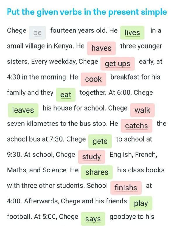 Chege is fourteen years old. He lives in a small village in Kenya He has three younger sisters. Every weekday, Chege gets up early, at 4:30 in the morning. He cooks breakfast for his family and they eat together. At 6:00, Chege leaves his house for school. Chege walks seven kilometres to the bus stop. He catches the school bus at 7:30. Chege gets to school at 9:30. At school, Chege studies English, French, Maths, and Science. He shares his class books with three other students. School finishes at 4:00. Afterwards, Chege and his friends play football. At 5:00, Chege says goodbye to his [...]