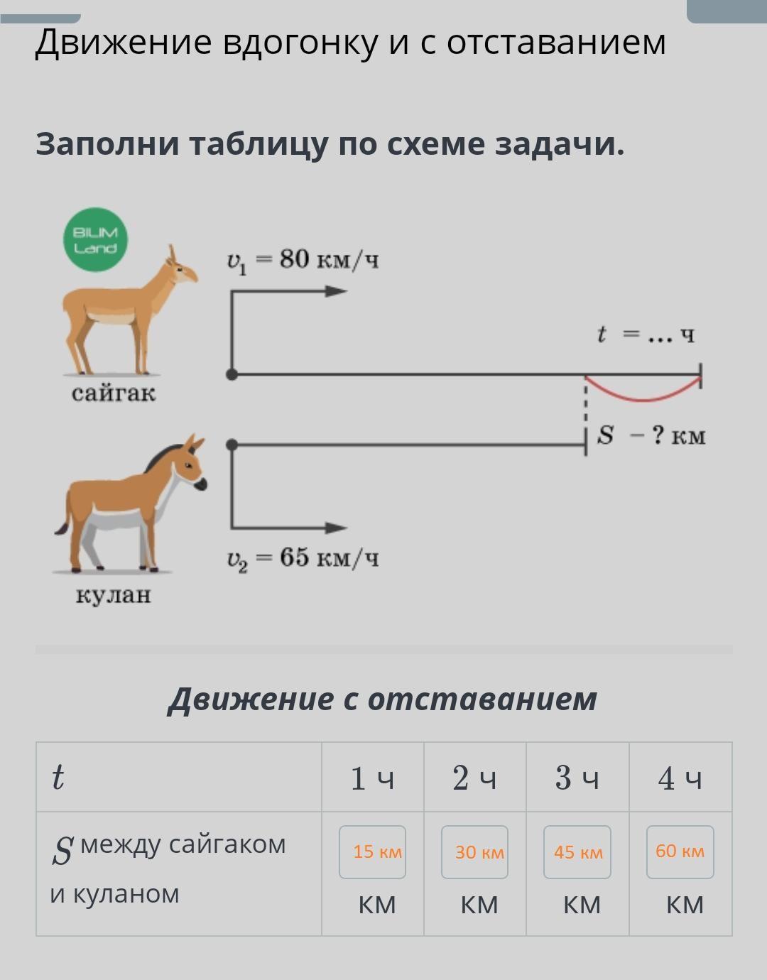Движение вдогонку и с отставанием Заполни таблицу по схеме задачи. Кулан = 80 км/ч t =... ч сайгак ? км U = 65 км/ч кулан Движение с отставанием 1 ч 2 ч 3 ч t Ѕ между сайгаком и куланом 4 ч KM KM KM KM