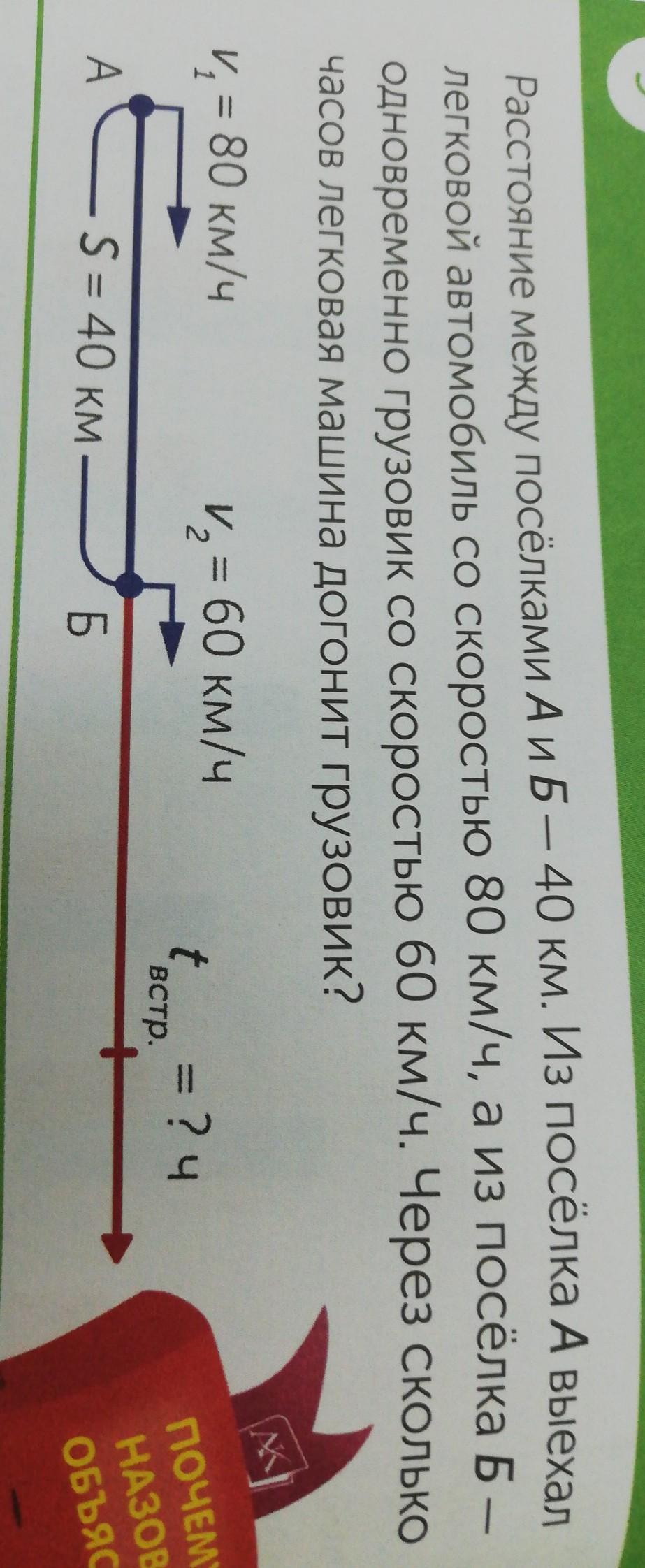 2. 40 км : 20 км/ч = 2 ч легковая машина догонит грузовик