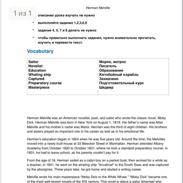Вегип Херман Мелвилл - американский писатель, поэт и моряк, написавший классический роман «Моби Дик». Герман Мелвилл родился в Нью-Йорке 1 августа 1819 года. Его отца звали Аллан Мелвилл, а мать - Мария. Герман был третьим из восьми детей. Его братья и сестры сыграли важную роль в его карьере, а также в его эмоциональной жизни. Образование Германа началось в 1824 году, когда ему было пять лет. Примерно в то же время Мелвиллы переехали в недавно построенный дом на Бликер-стрит, 33 в Манхэттене. Герман посещал Академию Олбани с октября 1830 по октябрь 1831 года, где он прошел стандартный подготовительный курс. В 1831 году ему пришлось бросить школу, так как родители не могли за это платить. С 18 лет Герман плавал юнгой на пакетботе, затем некоторое время работал учителем; в 1841 году он отправился на китобойном судне «Акушнет» в Южные моря и был взят в плен аборигенами. Три года спустя он вернулся домой и начал писательскую карьеру. Мелвилл написал свой главный шедевр «Моби Дик или Белый Кит». «Моби Дик» стал одним из самых известных романов XIX века. Этот роман о моряке Ишамаиле, который