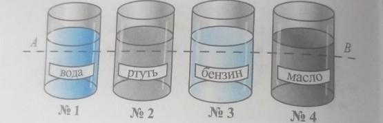 3. В каком из сосудов давление жидкости на уровне АВ наименьшее? (Поверхности жидкостей расположены на одном уровне.) [2]