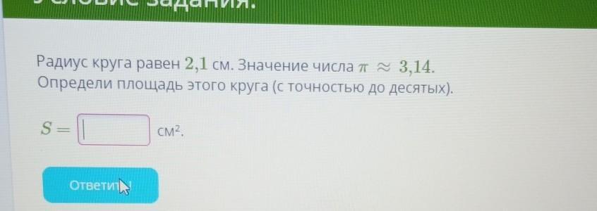 S = 3.14 * 2.1^2 = 3.14 * 4.41 = 13.8