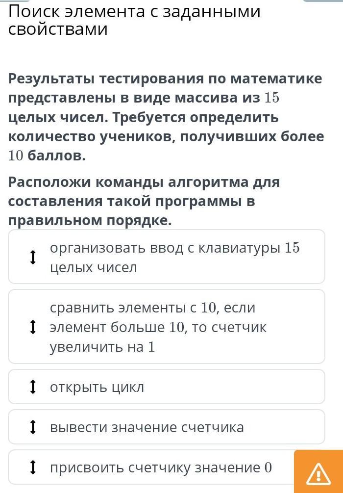 Результаты тестирования по математике представлены в виде массива из 15 целых чисел . Требуется определить количество учеников , получивших более 10 баллов . Расположи команды алгоритма для составления такой программы в правильном порядке