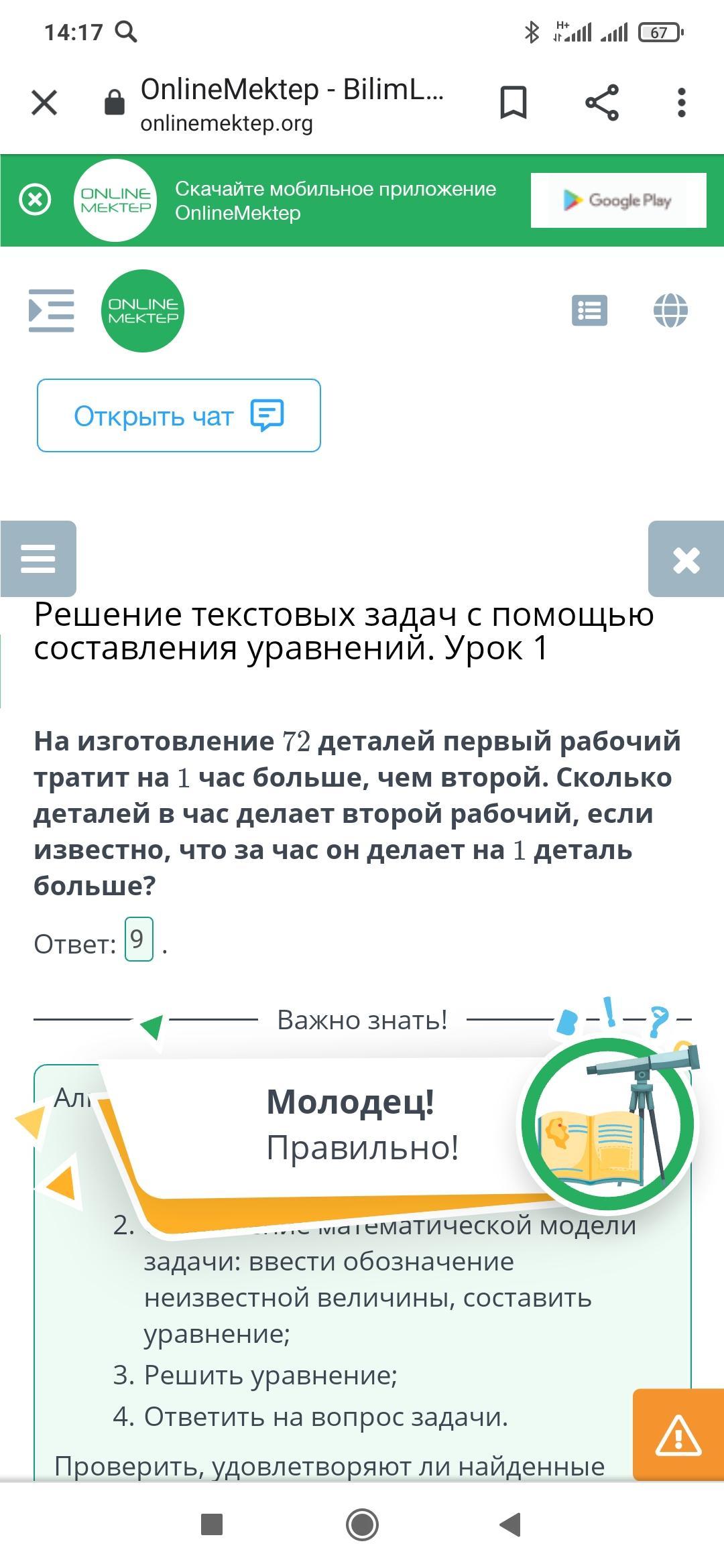 час делает второй рабочий, если известно, что за час он делает на 1 деталь больше?
