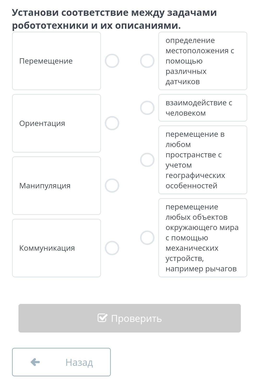 установи соответствие между задачами роботехники и их описаниями перемещение ориентация манипуляция комуникация