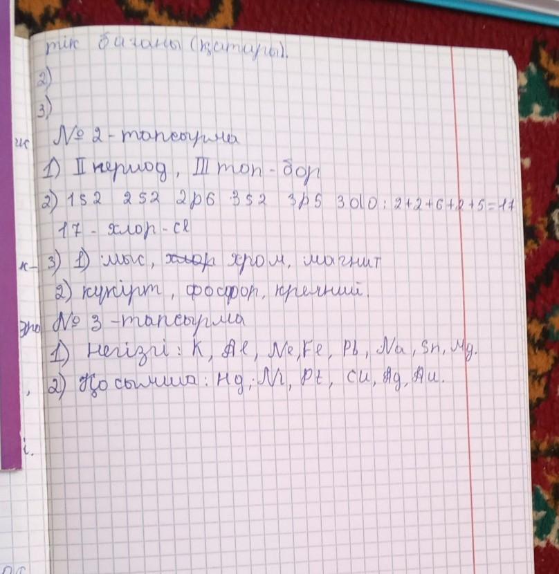 1-тапсырма1. Топ дегеніміз не?2.Периодтар мен топтардағы элементтердің металдық қасиеттері қалай өзгереді?3.Периодтар қалай жіктеледі?2 тапсырма. Қандайэлементтер екеніні анықта1. 2,8,2-2.ІІ период, ІІІ топ3.1s2 2s2 2p6 3s2 3p5 3d04.Мыс, кремний, хром, күкірт,фосфор,магнийметал мен бейметалды ажыратып жаз3-тапсырмаКестені дәптерге сызып, негізгі және қосымша элементтерін бөліп жазу: K, Hg, Nі, Al, Fe, Pt, Pb, Na, Cu, Sn, Ag, Mg, Auнегізгіқосымша