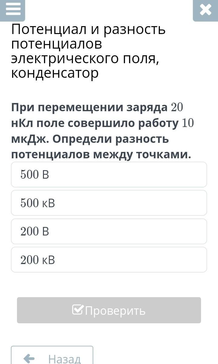 При перемещении заряда 20 нКл поле совершило работу 10 мкДж. Определи разность потенциалов между точками.