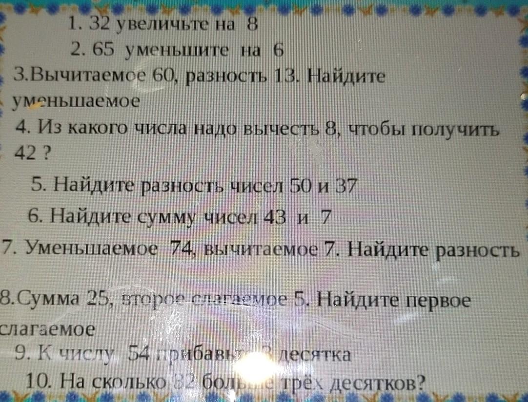 1)32+8=40 2)65-6*=59 3)60+13=73 4)50-8=42 5)50-37=13 6)43+7=50 7)74-7*=67 8)25-5=20 9)54+30=84 10)32-30 =2,на 2