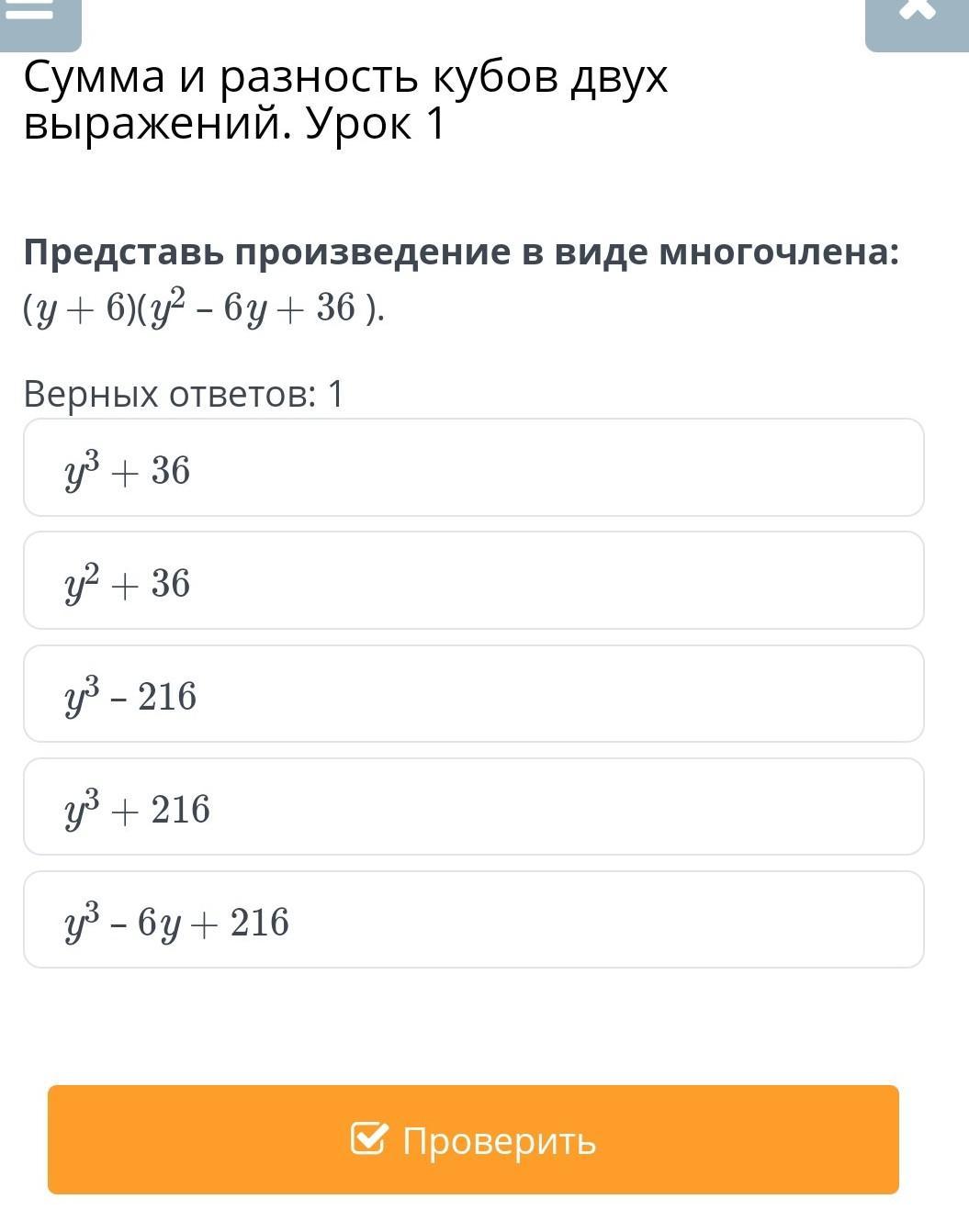 Верный ответ: y³+216