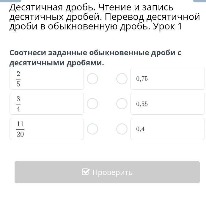Соотнеси заданные обыкновенные дроби с десятичными дробями.