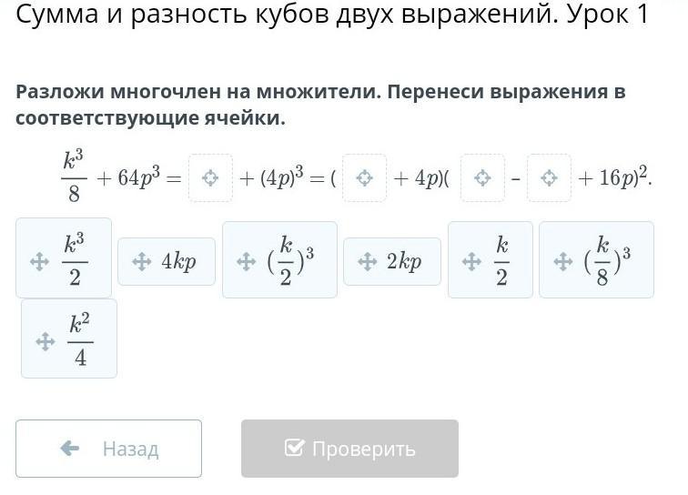 Разложи многочлен на множители. Перенеси выражения в соответствующие ячейки.