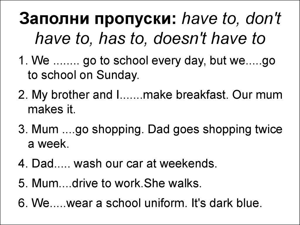 Заполни пропуски: have to, don " t have to, has to, doesn'