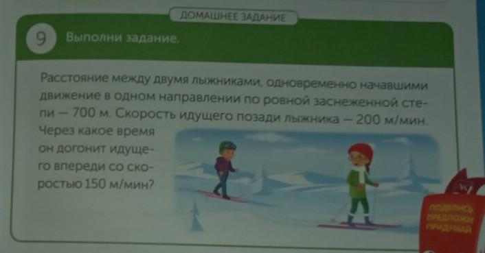 Выполни задание Реши задачу с условиями расстояние между двумя лыжниками одновременно начинающими движение в одном направлении по ровной заснеженной степи 700m скорость идущего позади лыжника 200 м в минуту Через какое время он догонит идущего впереди со скоростью 150 м в минуту.