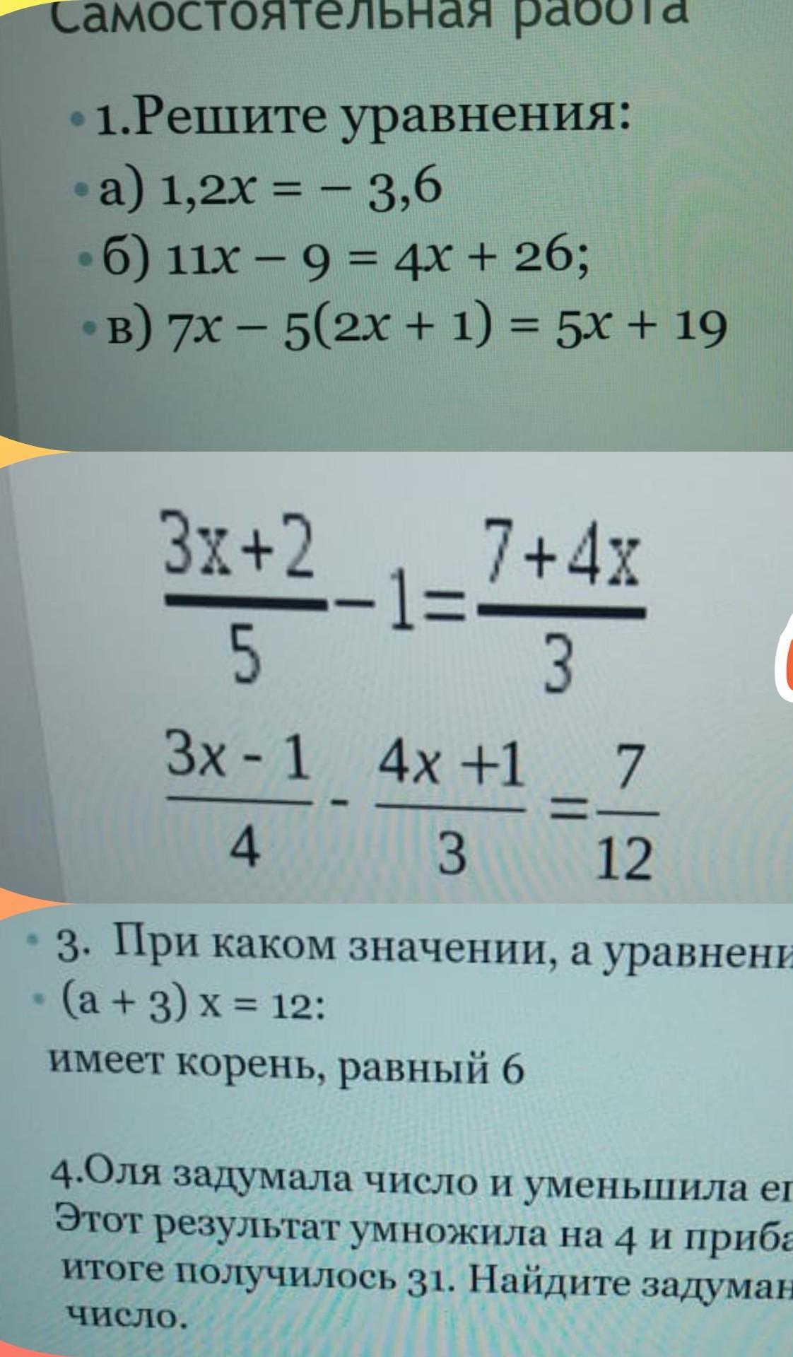 Оля задумала число и уменьшила его на3. Этот результат умножила на 4 и прибавила 7. В итоге получилось 31 . Найдите задуманное число