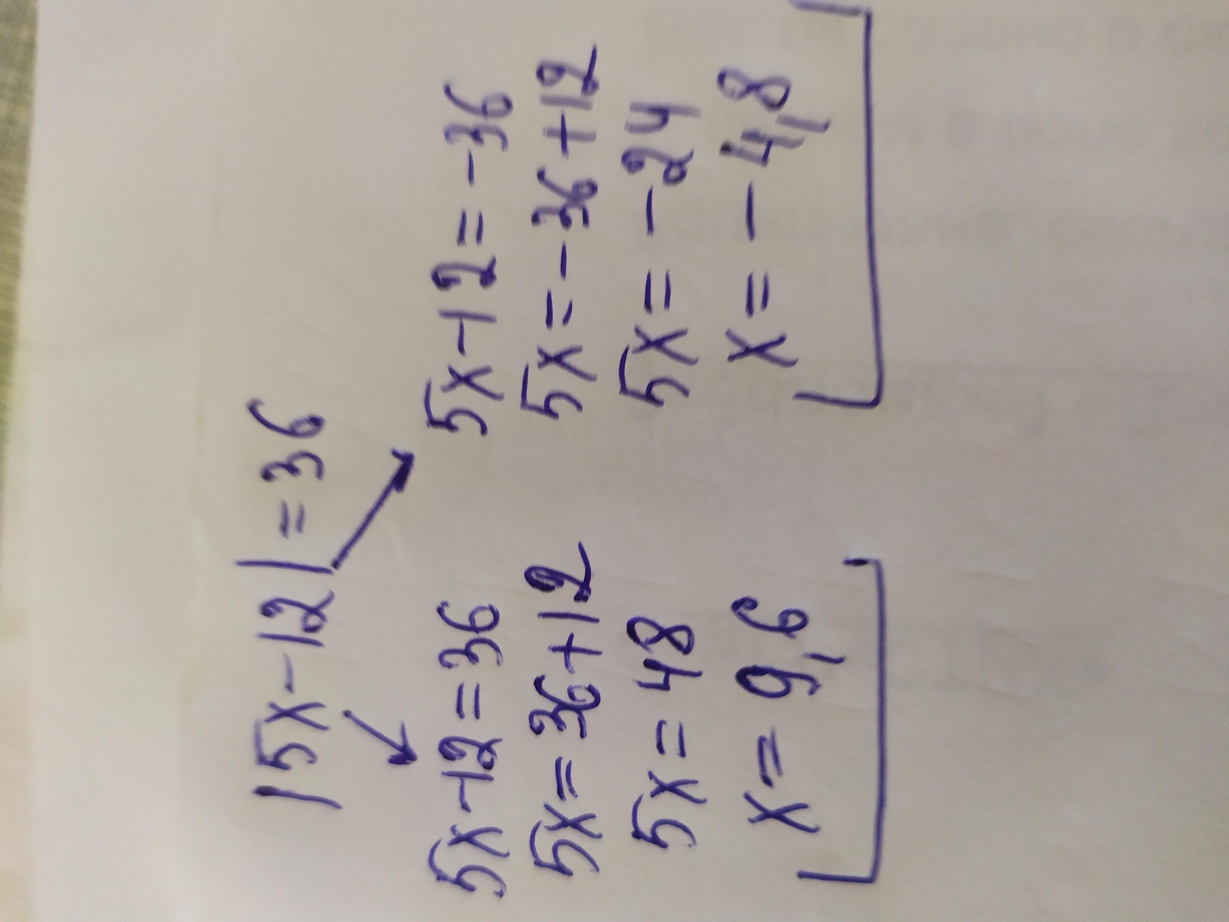 найдите корни следующего уравниея:|5x-12|=36 памагите пожалуйста​
