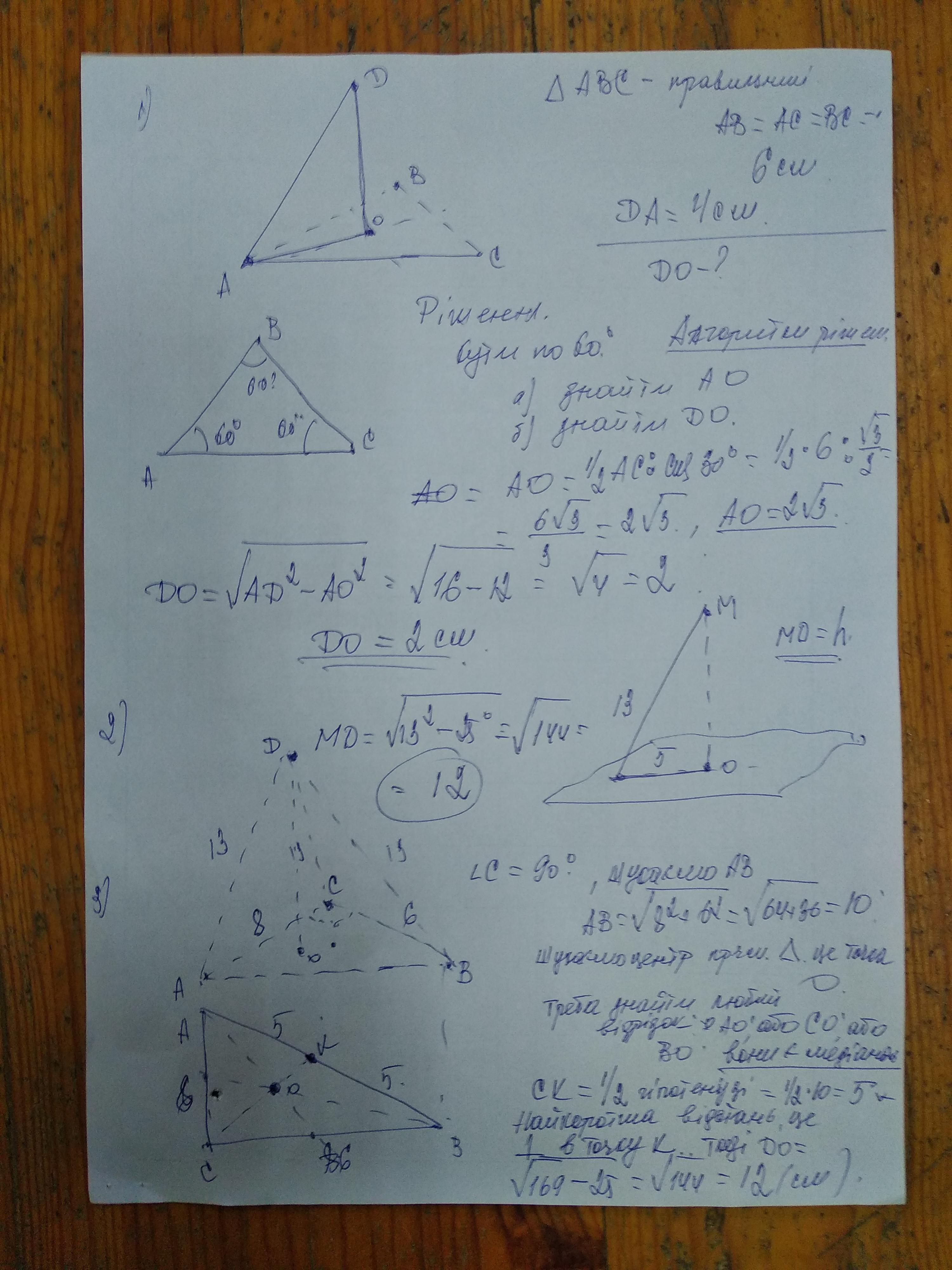1) r=АО=6/2√3=√3 радиус вписанной окружности. Теорема Пифагора √(4²-(√3)²)=√(16-3)=√13.