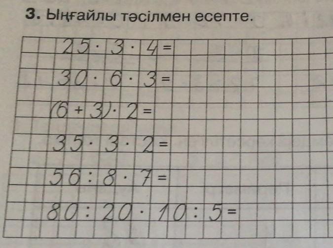 25 \times 3 \times 4 = 300 \\ 30 \times 6 \times 3 = 540 \\  (6  + 3)  \times 2 = 18 \\ 35 \times 3 \times 2 = 210 \\ 56 \div 8 \times 7 = 49 \\