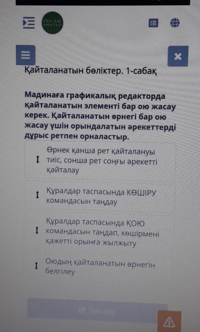 Мадинаға графикалық редакторда қайталанатын элементі бар ою жасау керек. Қайталанатын өрнегі бар ою жасау үшін орындалатын әрекеттерді дұрыс ретпен орналастыр. Өрнек қанша рет қайталануы I тиіс, сонша рет соңғы әрекетті қайталау Құралдар таспасында КӨШІРУ командасын таңдау Құралдар таспасында ҚОЮ 1 командасын таңдап, көшірмені қажетті орынға жылжыту Оюдың қайталанатын өрнегін белгілеу