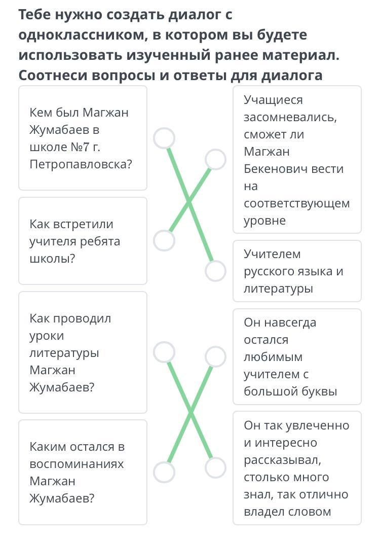 тебе нужно создать диалог с Одноклассников в котором вы будете использовать изученный ранее материал соотнеси вопросы и ответы для диалога Кем был Магжан Жумабаев в школе 7 Г Петропавловск Петропавловская Как встретили учителя ребята школы как проводил уроки литературу Магжан Жумабаев Какие остался в воспоминаниях Магжан Жумабаев