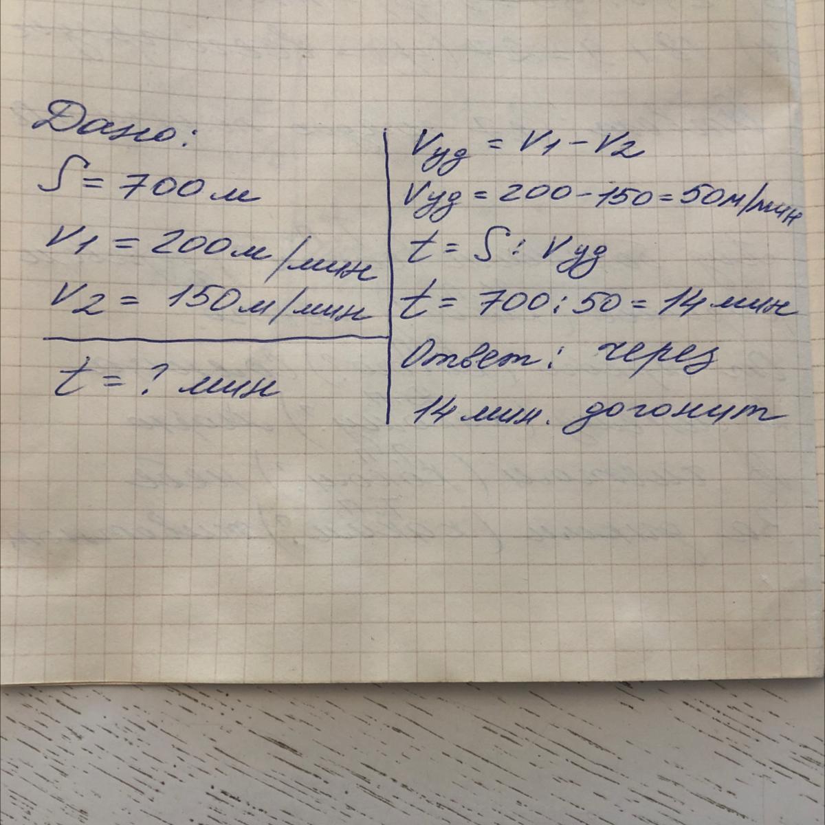 Пошаговое объяснение:V1=200м/мин V2=150м/мин S=700м