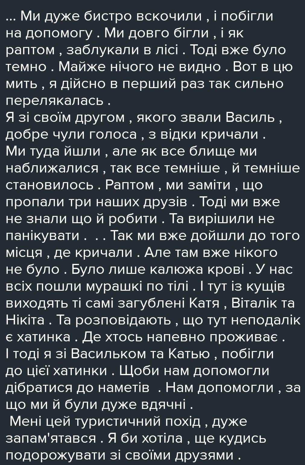 1. Діти вирушили в туристичний похід. Ввечері поставили намети, приготували вечерю і сіли відпочивати біля вогнища на березі річки. Раптом почули крик — хтось кликав на допомогу