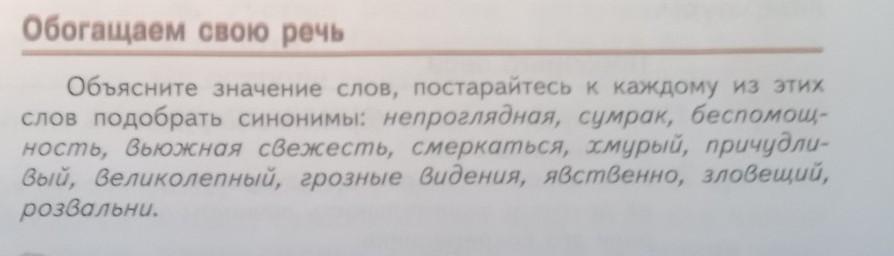 Непроглядная - кромешная, беспросветная; сумрак - мгла, полутьма; беспомощность - слабость; вьюжная свежесть - метельная прохлада, бодрость; смеркаться - темнеть; хмурый - серый ( если туча ), печальный (если человек); причудливый - необычный; великолепный - прекрасный; грозные видения - суровый,ужасный сон; явственно - очевидно; зловещий - ужасный, жуткий; розвальни - сани.