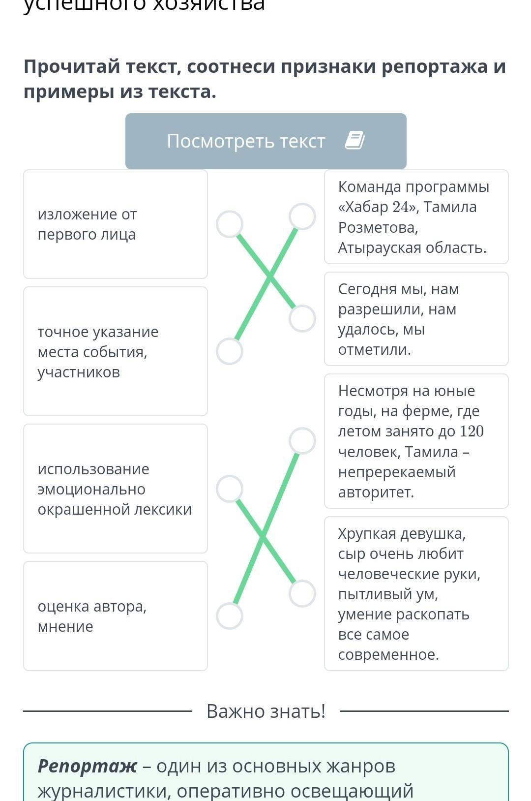 Прочитай текст, соотнеси признаки репортажа и примеры из текста.