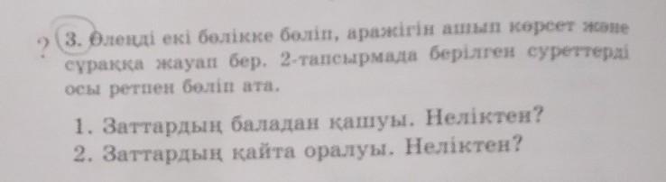 3. Өлеңді екі бөлікке бөліп, аражігін ашып көрсет және сұраққа жауап бер.2-тапсырма берілген суреттерді осы ретпен бөліп ата. 1.Заттардың баладан қашуы.Неліктен? 2.Заттардың қайта оралуы.Неліктен?