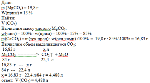 Какой объём углекислого выделится при прокаливании 19,8 г карбоната магния содержащего 15% примесей?