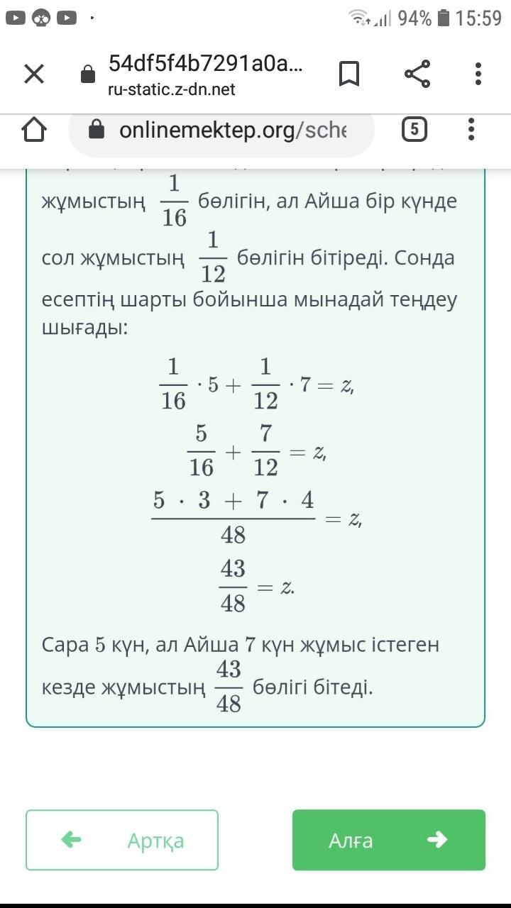 Сара бір жұмысты 16 күнде, ал Айша сол жұмысты 12 күнде бітіреді. Егер Сара 5 күн, ал Айша 7 күн жұмыс істесе, онда жұмыстың қандай бөлігі бітеді? тееез