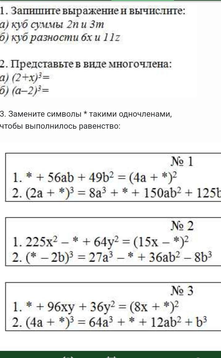 1.\ \ 16a^2+56ab+49b^2=(4a+7b)^2\\\\2.\ \ (2a+5b)^3=8a^3+60a^2b+150ab^2+125b^3\\\\\\1.\ \ 225x^2-240xy+64y^2=(15x-8y)^2\\\\2.\ \ (3a-2b)^3=27a^3-18a^2b+36ab^2-8b^3\\\\\\1.\ \ 64x^2+96xy+36y^2=(8x+6y)^2\\\\2.\ \ (4a+b)^3=64a^3+48a^2b+12ab^2+b^3