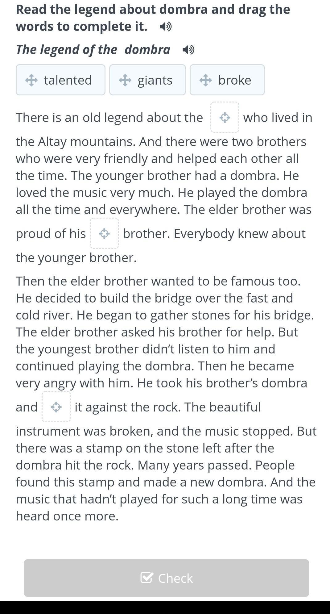 it against the rock. The beautiful instrument was broken, and the music stopped. But there was a stamp on the stone left after the dombra hit the rock. Many years passed. People found this stamp and made a new dombra. And the music that hadn’t played for such a long time was heard once more.