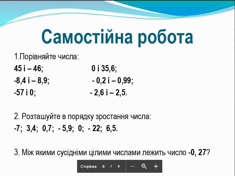 3. Між якими сусідніми цілими числами лежить число -0, 27?