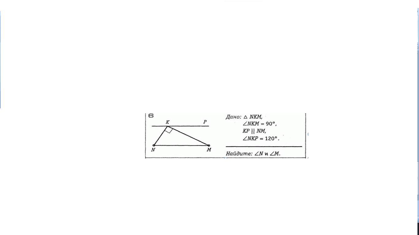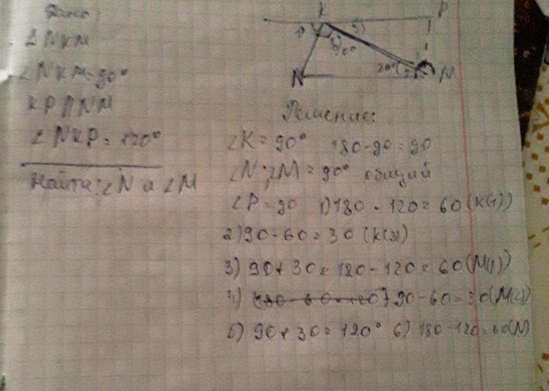 <M = <PKM как внутренние накрест лежащие. <PKM = <PKN - <NKM = 120 - 90 = 30. Следовательно <M =30 градусов. Т.к. сумма углов в треугольнике равна 180, то <N = 180 - 90 - 30 = 60 градусов.