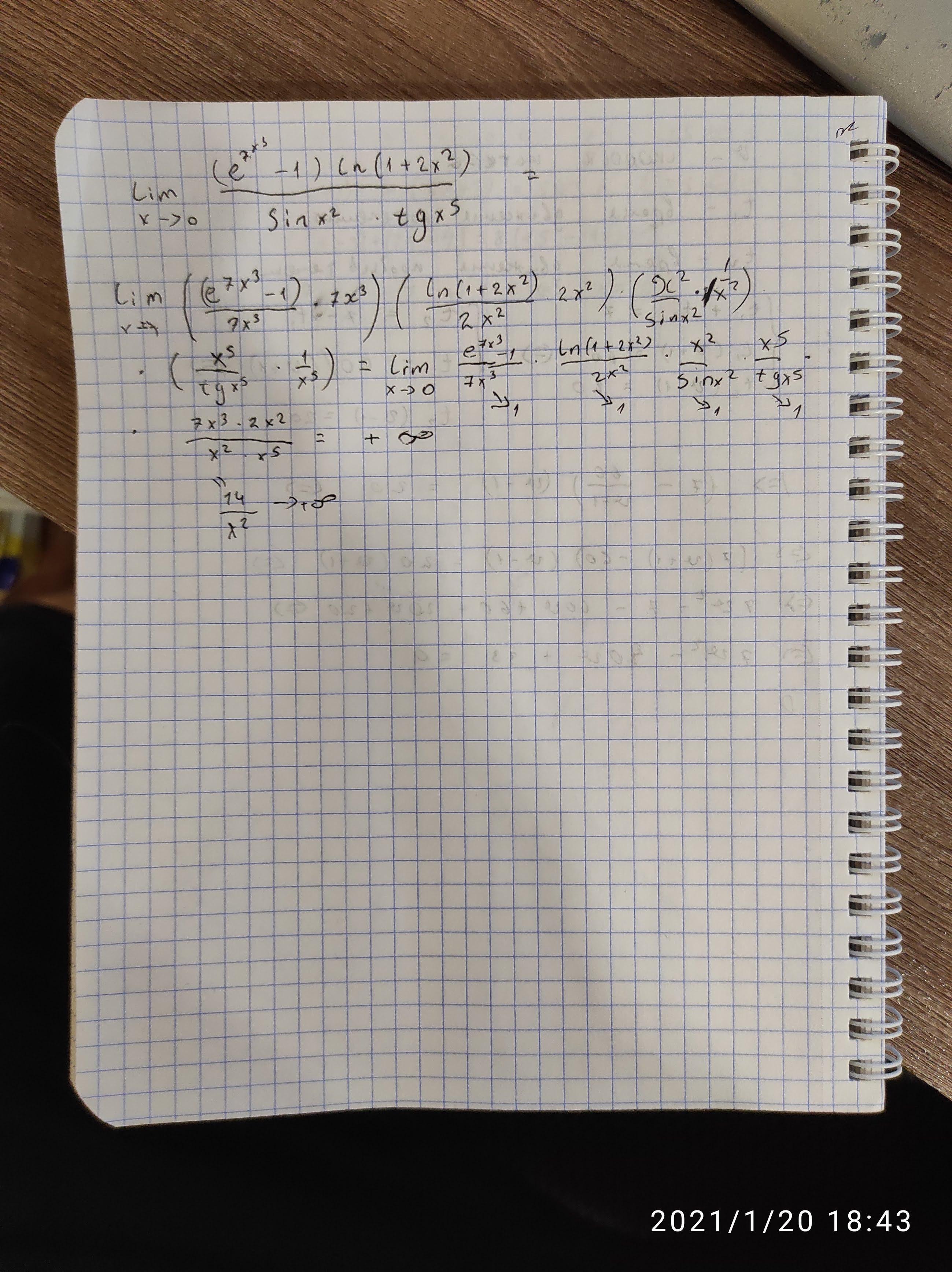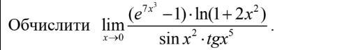 Здравствуйте нужно режить предел функции lim x->0 ((e^7x^3)-1)*ln(1+2x^2)/sin(x^2)*tg(x^5).Заранее спасибо!
