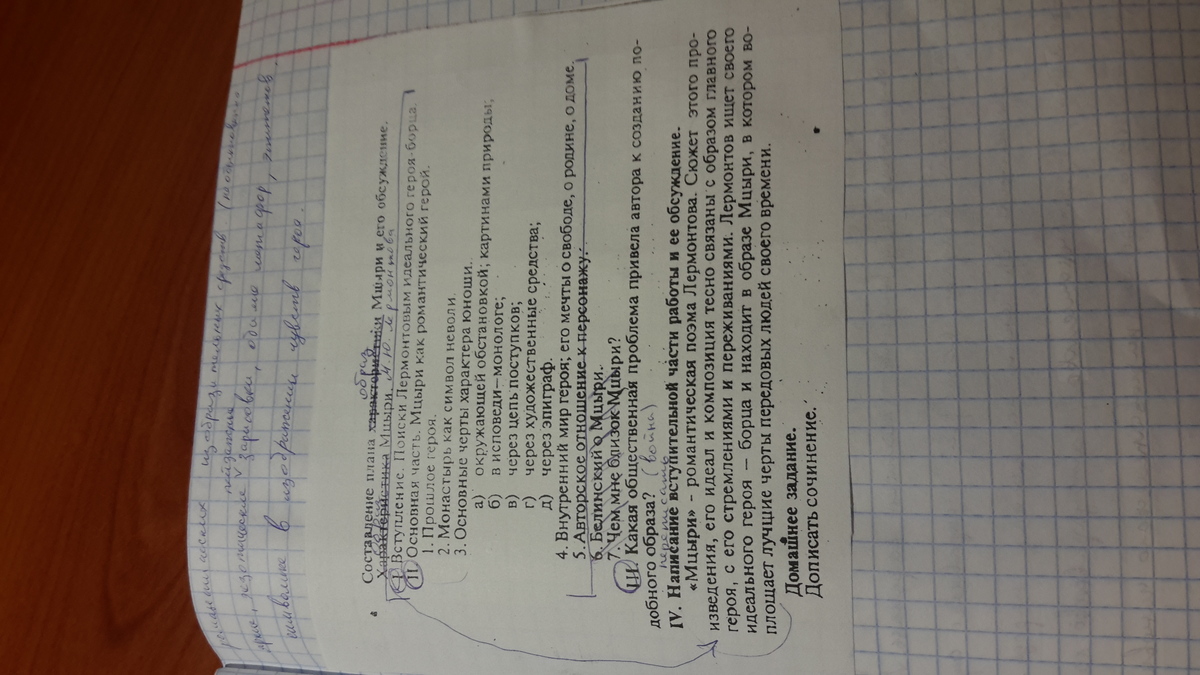 Все действия и поступки Мцыри — это образец несгибаемости духа и силы характера. Он ищет свою родину, даже не зная, где она находится, он владеет собой в любой ситуации, не обращает ни малейшего внимания на то, что он голоден, что ему приходится спать прямо на земле.