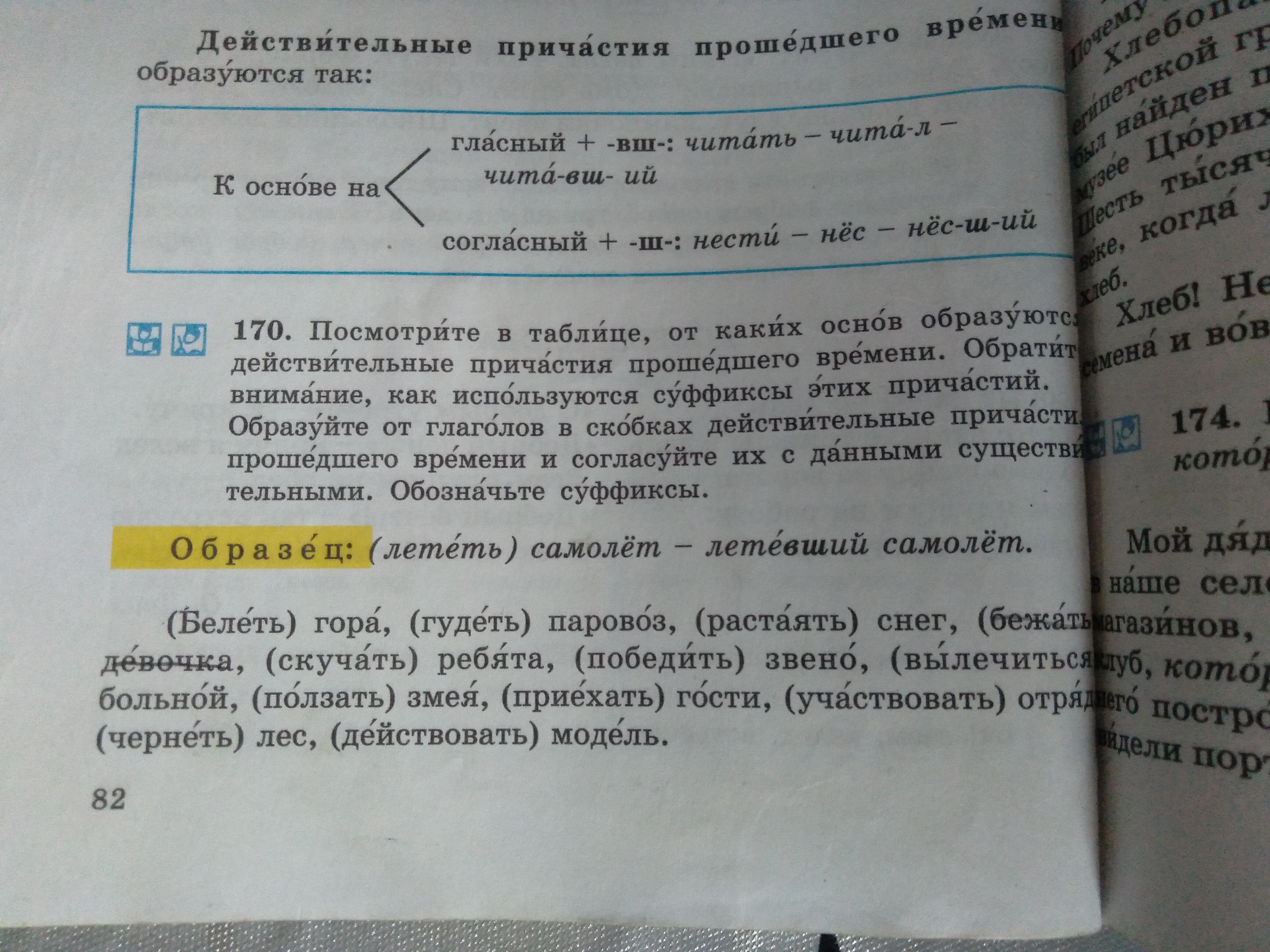 болевшая гора, гудящий паровоз , растаявший снег , скучающие ребята , победивший звено , вылечивший больной , ползучая змея , приехавшие гости, участвующий отряд , действующая модель.