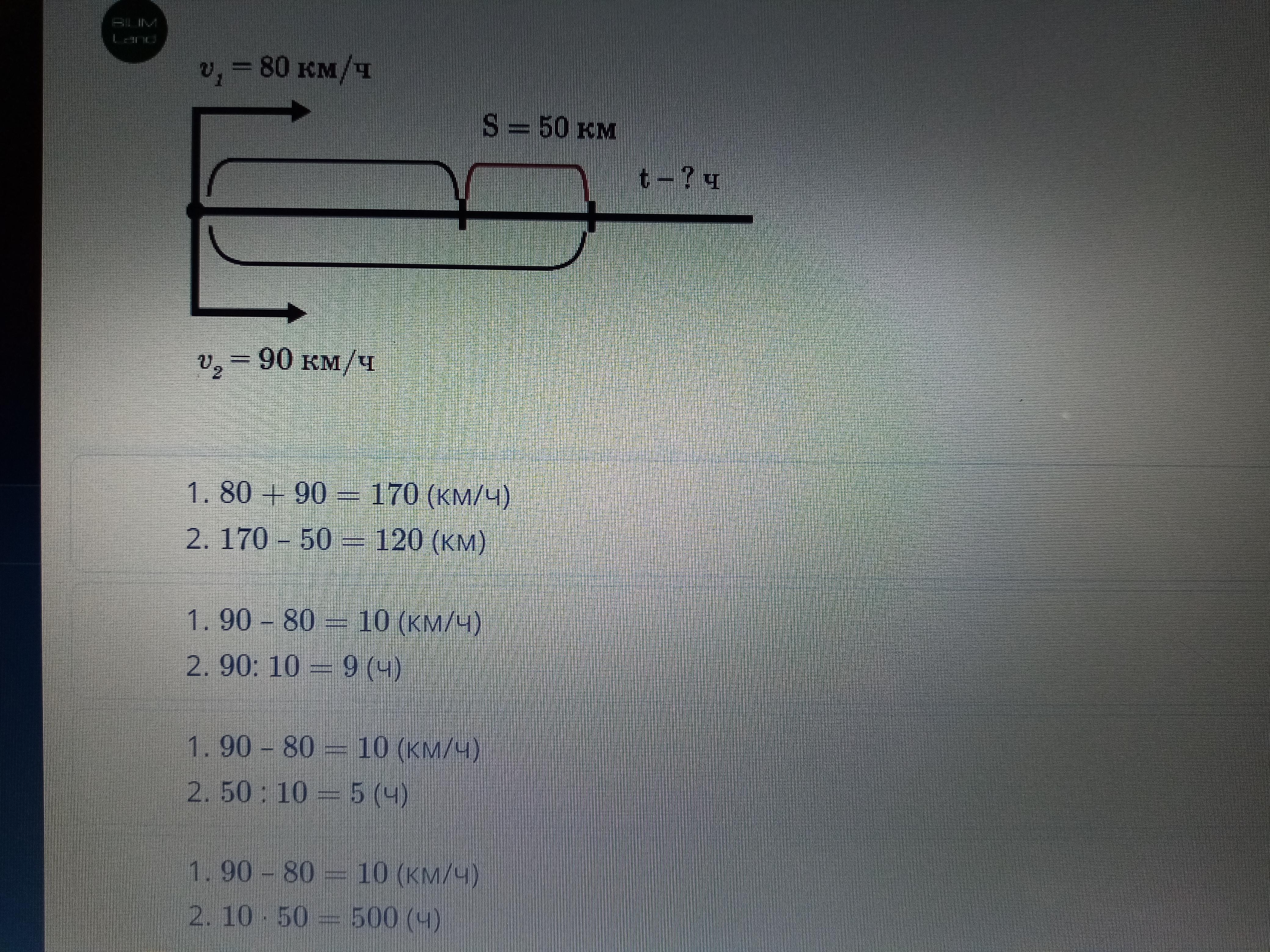 Из одного населённого пункта, в одном направлении одновременно выехали два автомобиля. Один ехал со скоростью 80км/ч, а второй 90км/ч. Через какое время между нами будетб50 км. Помагите пожалуйста