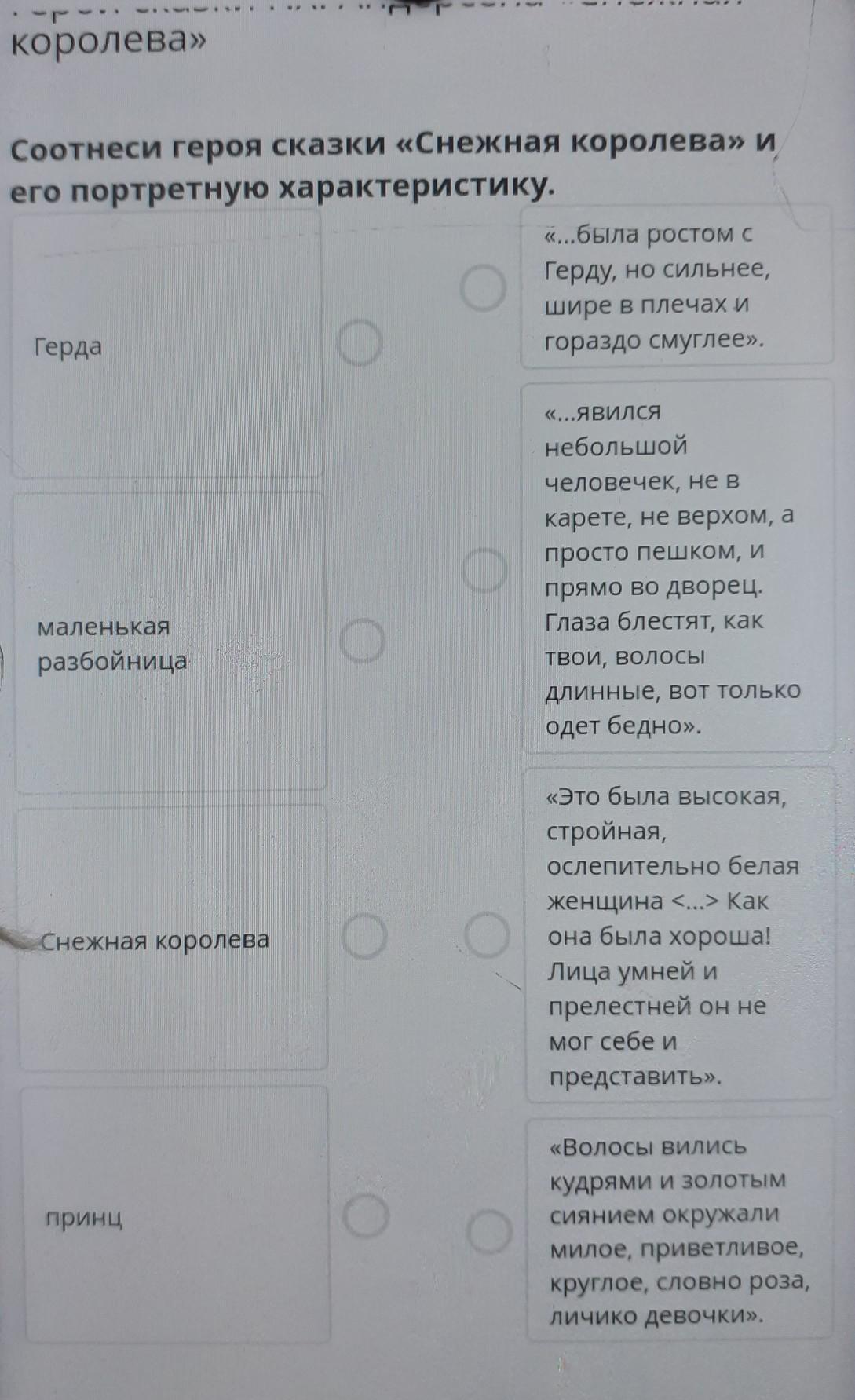 помогите плиз соотнеси героя сказки Снежная королева и его портретную характеристику