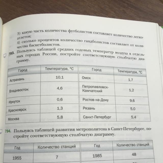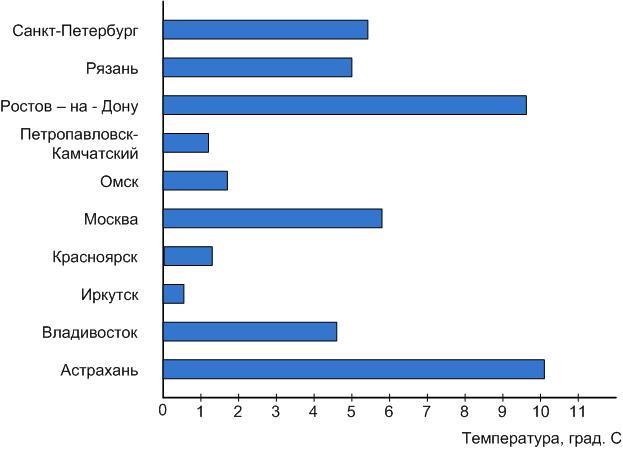 Пользуясь таблицей средних годовых температур воздуха в отдельных городах России, постройте соответствующую столбчатую диаграмму.