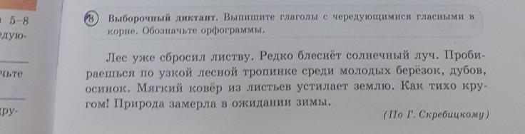 Выборочный диктант. Выпишите глаголы с чередующимися гласными в Пег уже сбросил листву. Редко блеснет солпечшый луч. Проби- лься по узкой леснои тропинке среди молодых берёзок, дубов, лок, Мягий ковер из листьев устиласт землю. Как тихо кру- ! Природа замерла в ожидании зимы. орие. Обознячьте орфограммы. ПОЖАЛУЙСТА ПОМОГИТЕ ДАМ 30 БАЛЛОВ