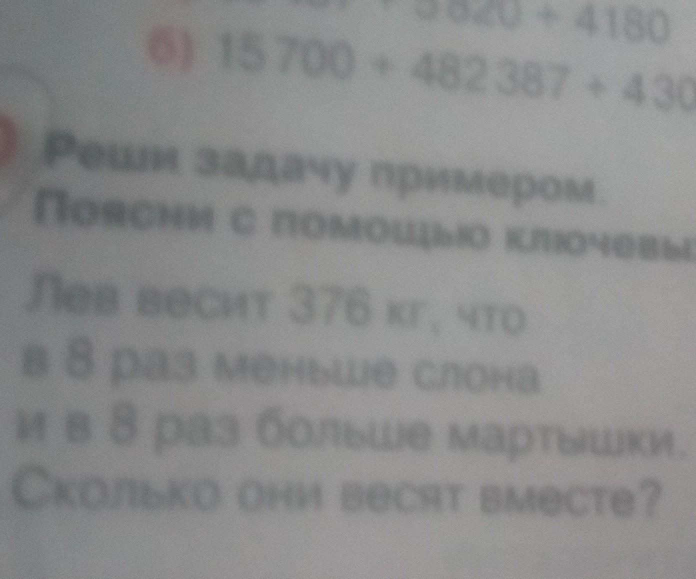 Лев - 376 кг , Слон -376*8 кг, Мартышка - 376:8 кг, Сколько всего - ? 376+376*8+376:8=3431 кг все вместе