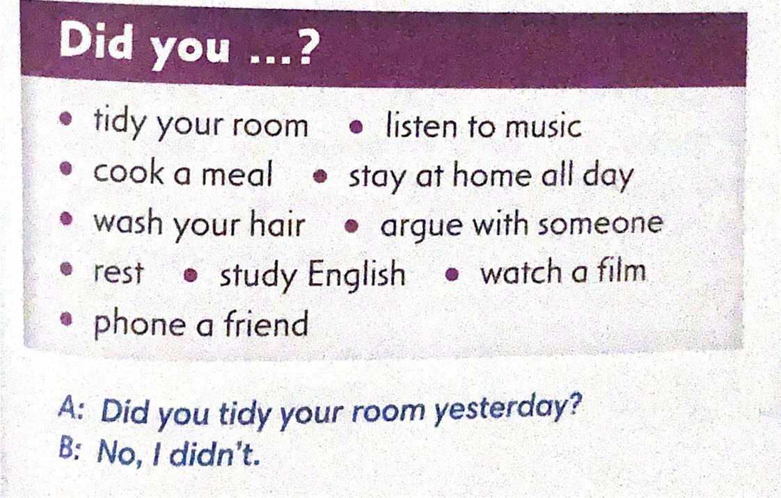 Подставляешь к Did you все те пункты в табличке по одному, ничего не меняю и в конце пишешь yesterday, как в примере.