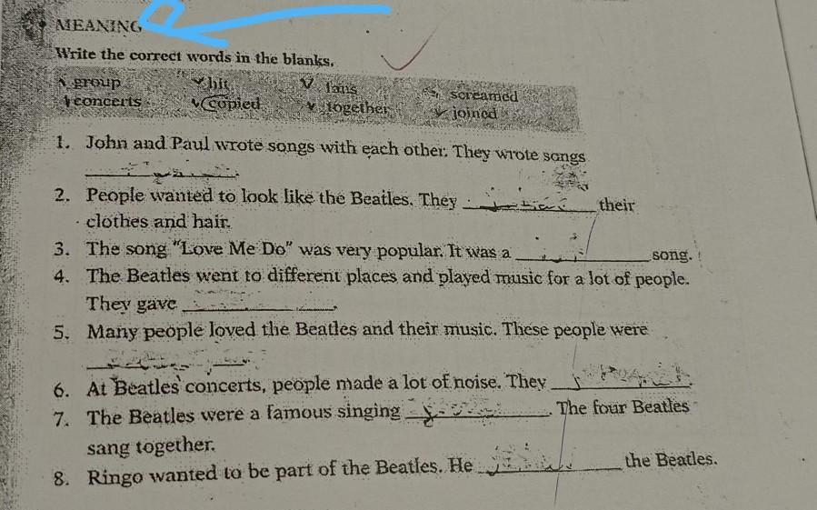 MEANING Write the correct words in the blanks, A group tconcerts Yhit Copied. V lans Screamed V joined V together 1. John and Paul wrote songs with each other: They wrote songs 2. People wanted to look like the Beatles. They clothes and hair. 3. The song "Love Me Do" was very popular. It was a 4. The Beatles went to different places and played music for a lot of people. their song. They gave 5. Many people loved the Beatles and their music. These people were 6. At Beatles concerts, people made a lot of noise. They 7. The Beatles were a famous singing The four Beatles sang together. 8. Ringo wanted to be part of the Beatles. He the Beatles.