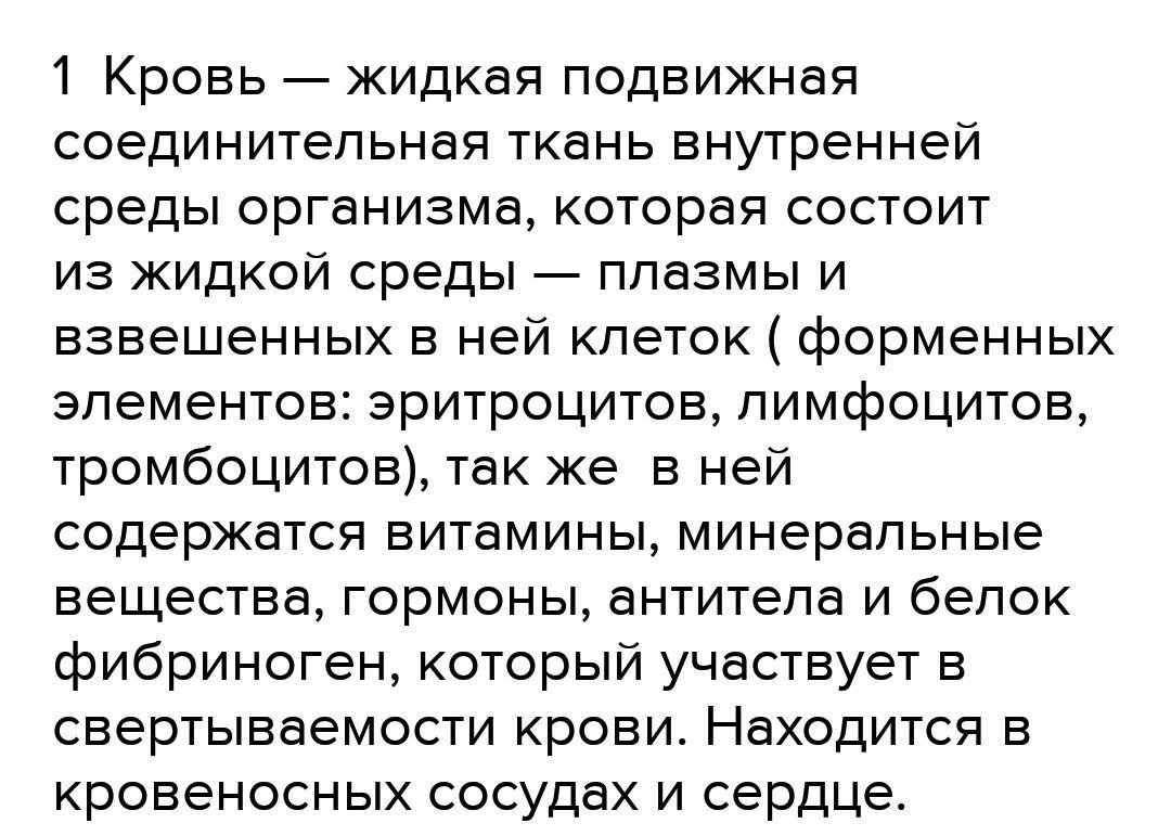 Кровь — жидкая подвижная соединительная ткань внутренней среды организма, которая состоит из жидкой среды — плазмы и взвешенных в ней клеток ( форменных элементов: эритроцитов, лимфоцитов, тромбоцитов), так же в ней содержатся витамины, минеральные вещества, гормоны, антитела и белок фибриноген, который участвует в свертываемости крови. Находится в кровеносных сосудах и сердце.